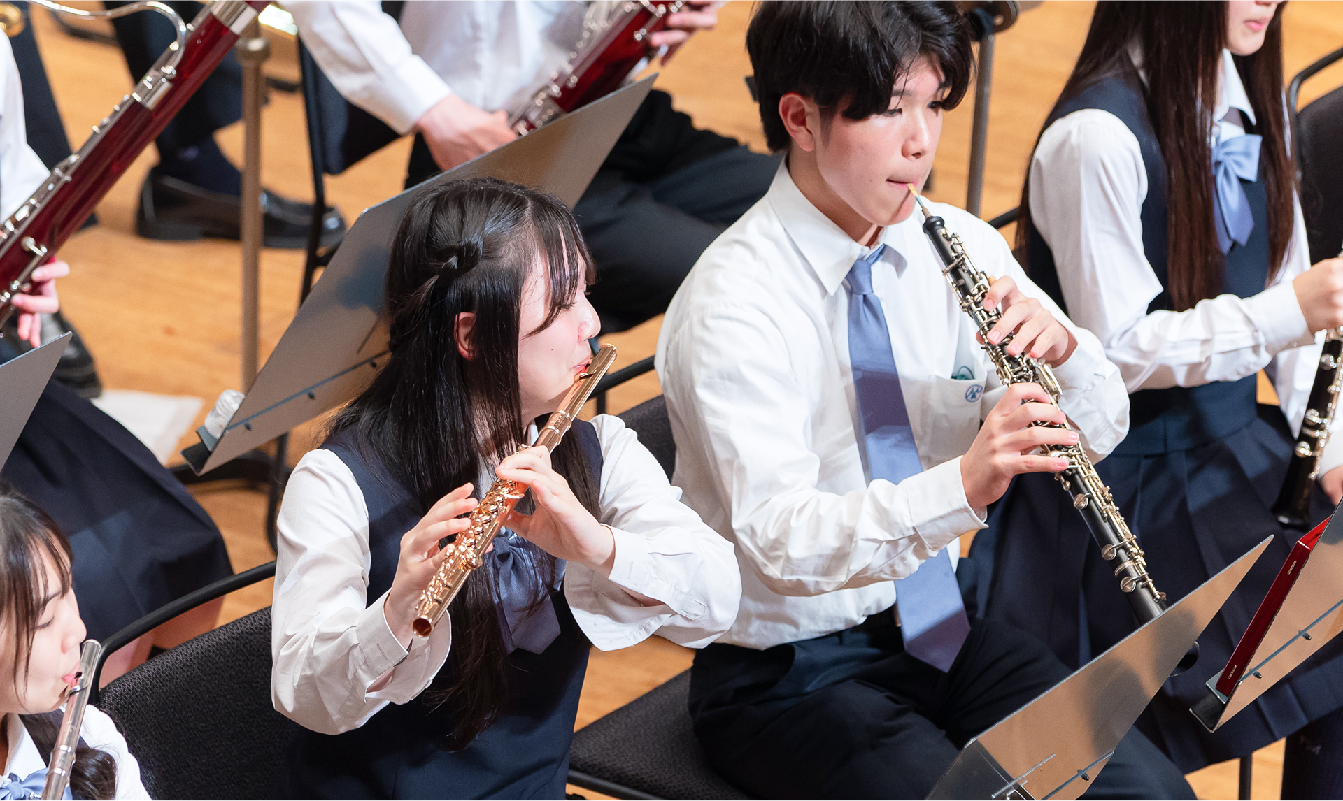 息づかいや奏者の個性で変化する、管打楽器の豊かな音色を、吹奏楽やオーケストラなど、さまざまな編成でのアンサンブルを通し、ハーモニーを多角的に理解する洞察力と技術力を磨きます。