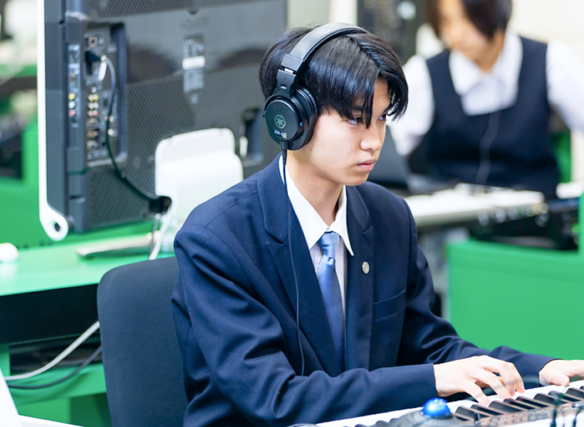 音楽総合コース内に設けられた「セルフデザインクラス」は、『感性を育み、自分が実現したい未来を描き、それを構築できる力をもった人材の育成』を目標としています。自分自身が興味をもっている分野やテーマを選び、自己表現の方法を探求することができます。さまざまな分野の学びを融合させながら、自分なりのアイデアを創造し、実現することを目指しています。自己表現をするだけでなく、社会問題や地域の課題などを解決するために、自分たちの創造力や力を社会に向けて発揮することも重視しています。自己実現のためのスキルを身につけながら、社会に貢献することができる人材に成長させるプログラムを用意しました。また、入学の段階では音楽に関する能力や知識がなくとも、3年間で音楽大学に進学できるレヴェルの基礎力を身につけることができます。実技レッスンではピアノと作曲を中心に学び、音楽を使って社会で幅広く活躍するためのスキルを修得します。