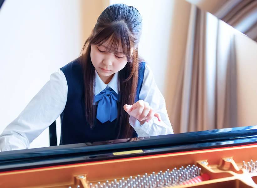 すべての音楽家が基礎として学ぶピアノ。華やかなステージで演奏するプロのピアニストを目指すのはもちろんのこと、ピアノを学ぶ意義は、音楽の本質を理解し、自分の感性を磨き上げる点にもあります。ピアノ1台あれば、1人でさまざまな音楽を表現することができるのです。本校ではピアノ独自の特性を修得するために、個人レッスンやピアノアンサンブルを始め、日々の練習や学校生活を通して多様性と洞察力を磨きます。